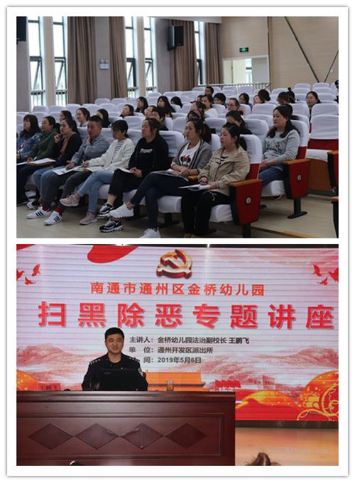 为贯彻落实中央省、市、区扫黑除恶专项斗争工作部署,推动扫黑除恶专项斗争深入开展,进一步提高我园全体教职工的思想认识,为建设平安校园保驾护航,5月6日下午,金桥幼儿园法制副校长,开发区派出所所长王鹏飞来园进行“扫黑除恶”专题讲座。