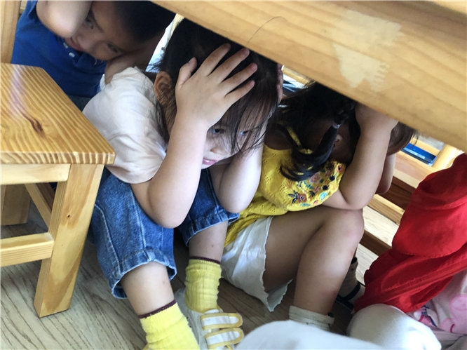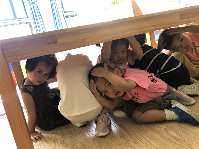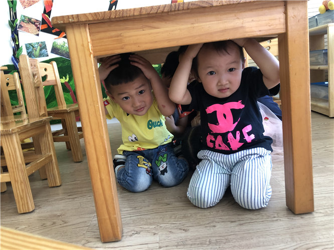 这也是我们小五班的宝贝们第一参与防空演习,瞧!他们抱着头,躲进了桌子底下,反应快极了!