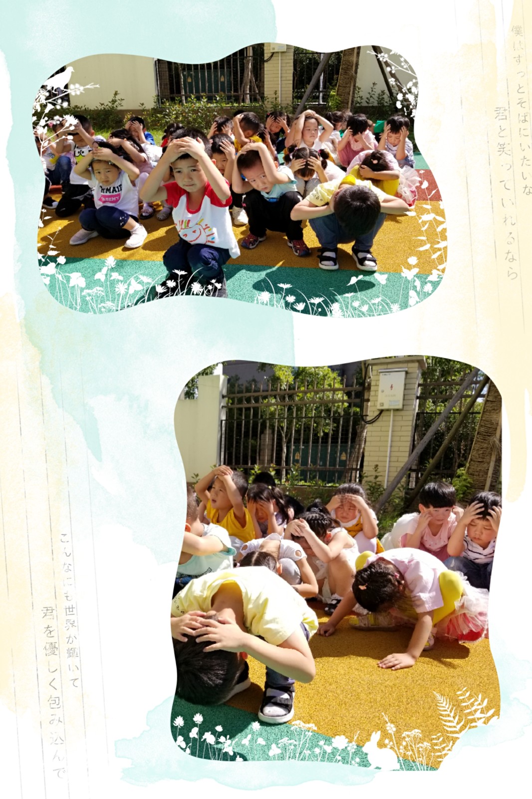 为了进一步增强宝贝们的自我保护意识和能力,全区拉响了凄厉的防空警报声,宝贝们也随即展开了“防空袭演练”活动,宝贝们小手护着脑袋,弯着腰,井然有序地完成了演练活动。