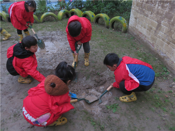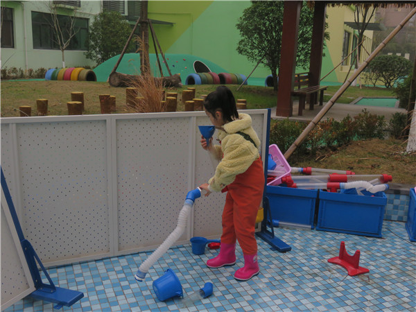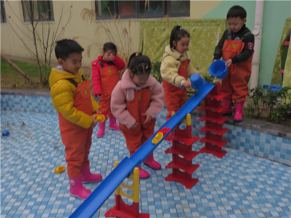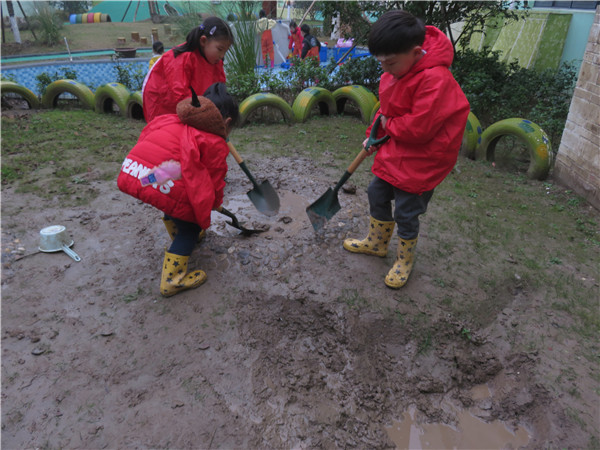 今天,小朋友们来到了泥水区,瞧,好玩的激流勇进通过孩子们的努力搭建完成啦!小船正在汹涌的波浪里漂流呢!另一边,玩泥巴的小朋友们正在搬运泥土,他们要建一个泥土做的城堡呢。