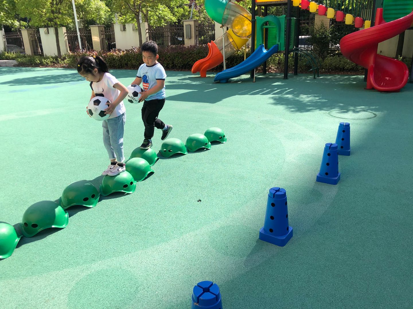 晨间锻炼开始了,小朋友们拿出乌龟壳和单元筒,玩起了足球保卫战的游戏,比一比谁能最快将足球运动到终点,谁对足球的控制能力最好。