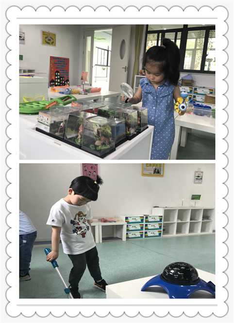 瞧!有的手里拿着望远镜,还有的一边拿着放大镜一边在和自己的好朋友分享小发现呢!可真是太有意思了!