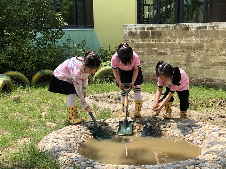 泥水有一种天然的亲和力,无论多大的孩子都会爱上它,从中找到无尽的欢乐。孩子们在这一泥一水间发挥想象力、拥有空间意识,还增强了手眼协调能力、锻炼手臂肌肉发展,也让孩子发展了团队合作和社会交往能力,在游戏中享受着大地之美、感受着自然的无穷力量。