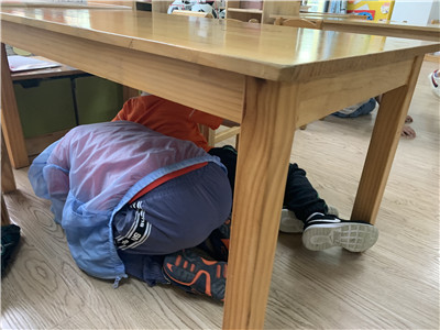 尖锐的警笛声打破了幼儿园的宁静,“有歹徒闯入幼儿园,全体职工注意安全措施,保护幼儿人身安全”,老师们马上锁紧门窗,小朋友们在老师的引导下有序地疏散,躲避在桌子下面,老师们严阵以待,防止歹徒破门而入。